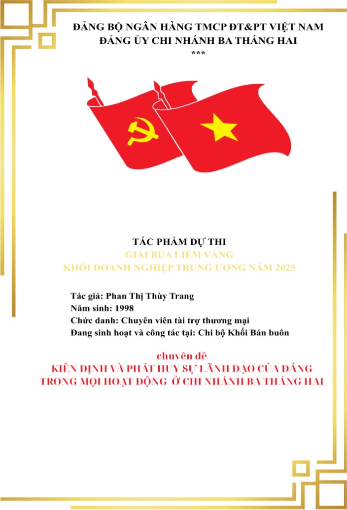 Kiên định sự lãnh đạo của Đảng không chỉ là một nguyên tắc chính trị, mà còn là kim chỉ nam xuyên suốt và là cội nguồn sức mạnh nội sinh, bảo đảm cho sự phát triển bền vững của Ngân hàng TMCP Đầu tư và Phát triển Việt Nam (BIDV) nói chung và Chi nhánh Ba Tháng Hai nói riêng. Là đơn vị tiên phong, đạt nhiều thành tích trên địa bàn và toàn hệ thống, Chi nhánh Ba Tháng Hai luôn tự hào khi Đảng bộ là hạt nhân chính trị vững chắc, dẫn dắt toàn bộ hệ thống từ công tác xây dựng Đảng đến việc tiên phong thực hiện các nhiệm vụ kinh doanh và trách nhiệm xã hội cao cả.